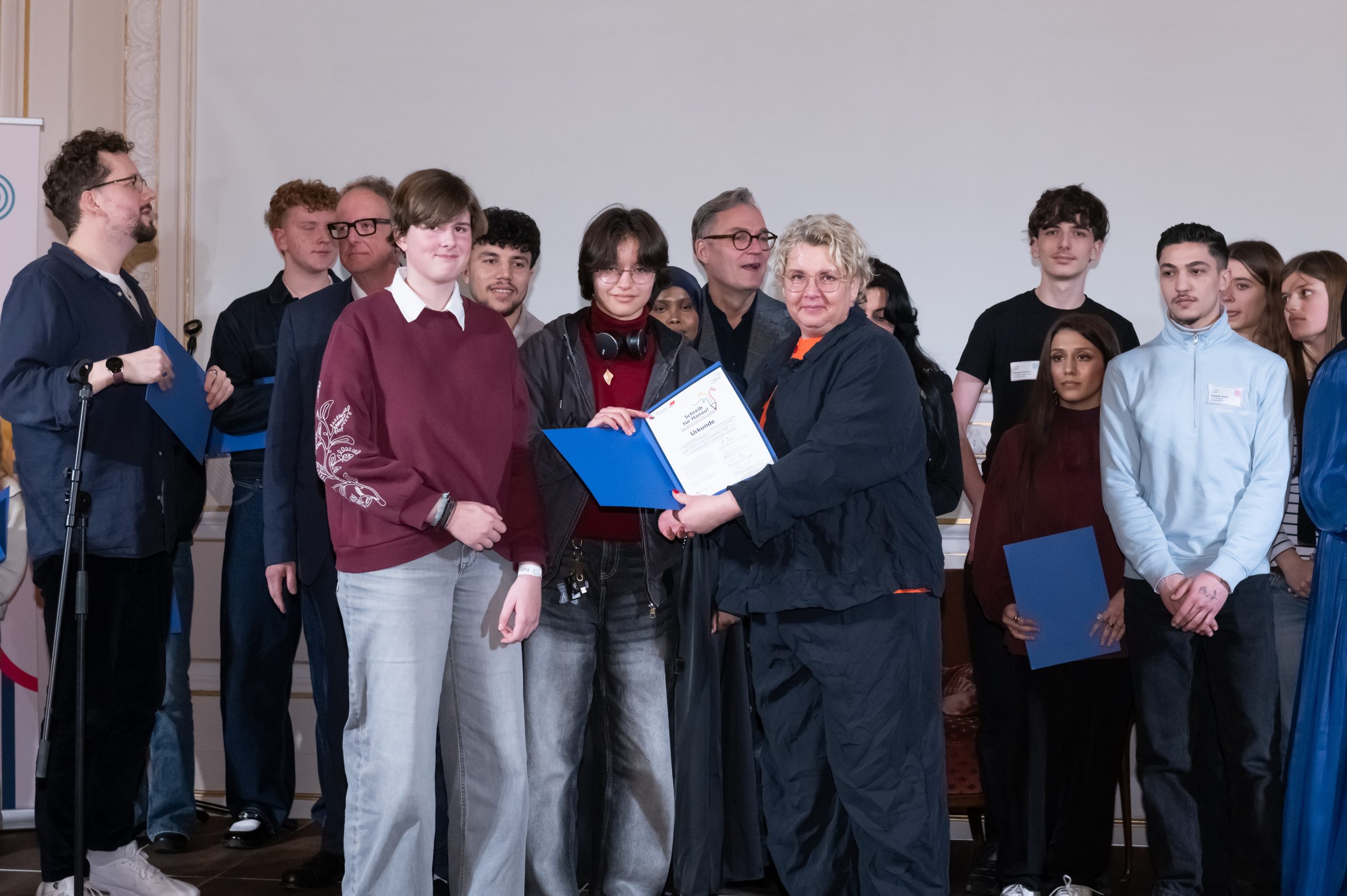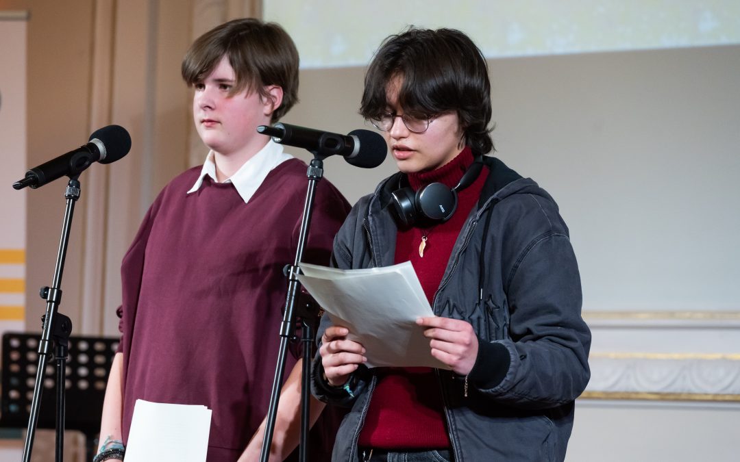 Die Reihenfolge der Vortragenden steht bereits fest und ist inklusive der Texte in einem aufwändig gestalteten Programmheft dokumentiert. Nacheinander treten die Schüler*innen ans Mikrofon und lesen ihre Texte, die allesamt unter die Haut gehen: Das Spektrum der Genres reicht von Briefen an die Opfer des Hanauer Anschlags über direkte Ansprachen ans Publikum, umfasst poetische Beschreibungen der eigenen Geschichte oder Familiengeschichte, die in anderen Kulturen verwurzelt ist, enthält eine szenische Lesung, in der eine deutsche Frau mit türkischem Namen in einer deutschen Arztpraxis um Anerkennung und Gleichbehandlung kämpft. Es geht thematisch um die über Jahrhunderte eingeschränkten Rechte der Frau, um subtile und offensive Erfahrungen der Diskriminierung aufgrund der eigenen sexuellen Orientierung oder anderer Merkmale. Auf der Bühne zeigen sich nacheinander ganz unterschiedliche junge Menschen, die Einblicke in Biografisches geben oder mit fiktiven Erzählungen auf ein gesellschaftliches Klima aufmerksam machen, in dem manche gleicher und freier sind als andere. Einige Stimmen sind eher leise und zurückhaltend, andere eindringlich und laut. Die Vielfalt zeigt: Engagement hat viele Töne und Facetten, kann offensiv oder auch im Hintergrund stattfinden, aber eines scheint zentral: Es findet niemals einsam statt, sondern mit vereinten Kräften. Gerade das Netz aus den unterschiedlichen Stimmen und Perspektiven, die sich in der Zielrichtung für mehr Achtung untereinander treffen, wird der Zerreißprobe am besten standhalten, der unsere Gesellschaft derzeit ausgesetzt ist und weiterhin ausgesetzt sein wird. Eine Schülerin, deren Text besonders viel Poesie enthält, bringt es in einer schönen Wortkreation auf den Punkt: Es bedarf an mehr „Mitfühlkraft“, aus der die Stärke erwächst, uns gegen Verrohung und Ausgrenzung einzusetzen.