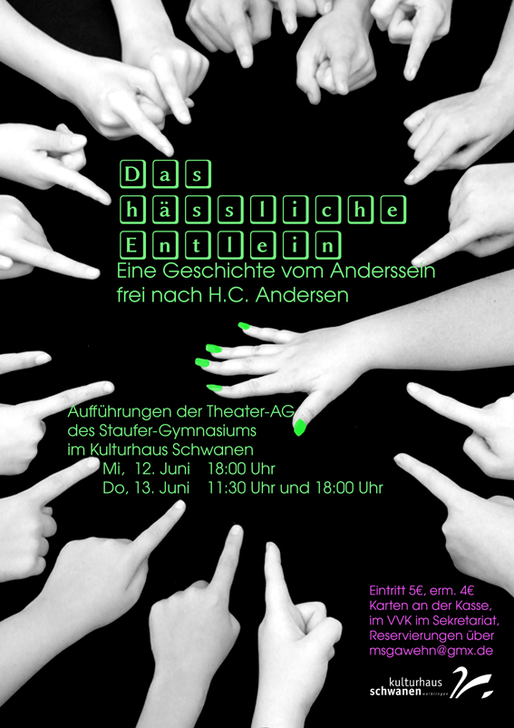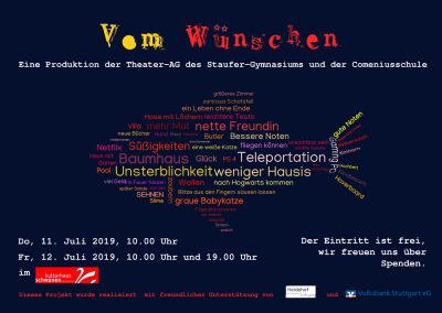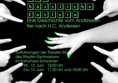 Nach einer komplett eigenen Stückentwicklung wenden wir uns dieses Jahr einem bestehenden und ganz alten Stoff zu und versuchen, ihn modern und auf unsere ganz eigene Weise auf die Schwanenbühne zu bringen – seid gespannt auf unsere Version von Shakespeares “Das Wintermärchen”! Wir basteln gerade zu zwölft an Text, Rollen, Kostümen, Bühnenbild, Theaterzauber und modernen Bezügen. Was bisher feststeht, ist der Aufführungstermin – haltet euch den 18. und 19. Juni 2026 frei!